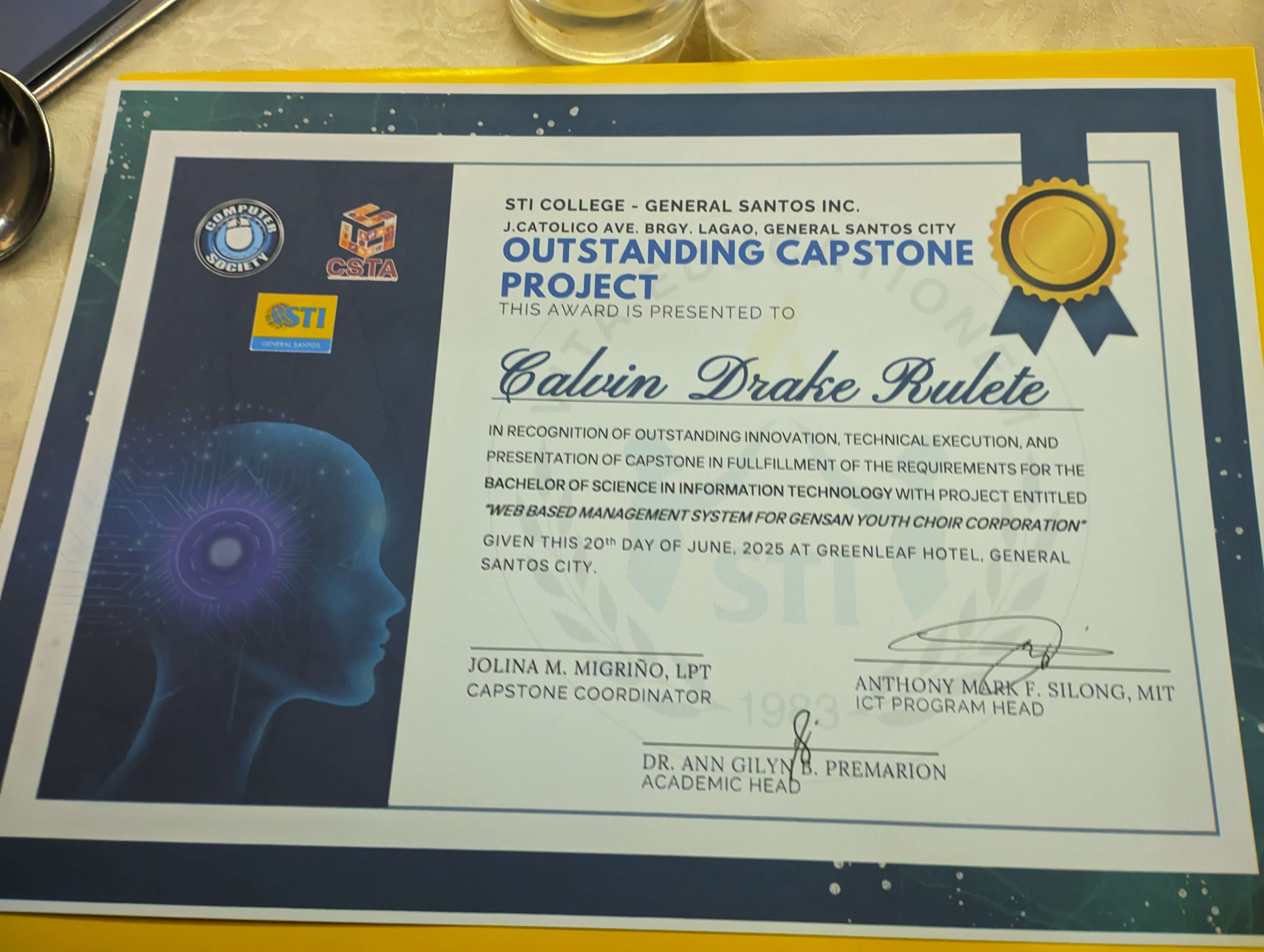 Outstanding Capstone Project Awardee during STI College General Santos Graduation Ball on June 20, 2025.
